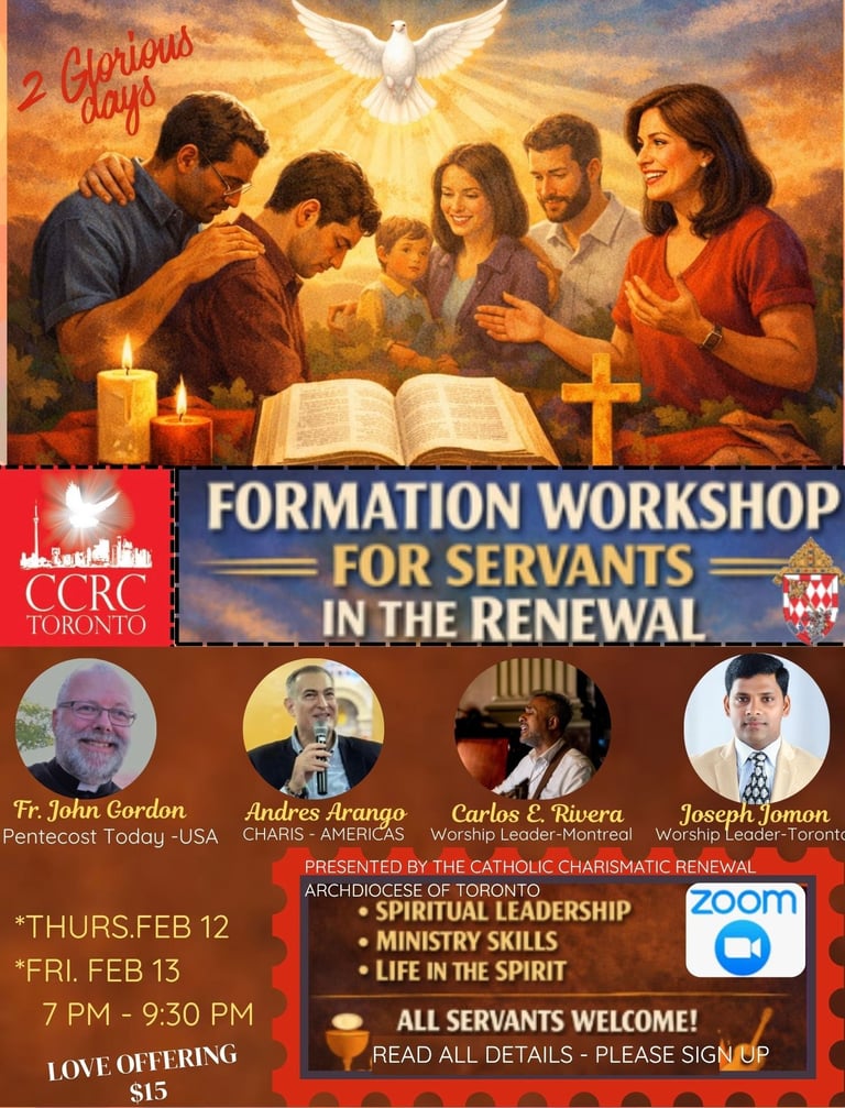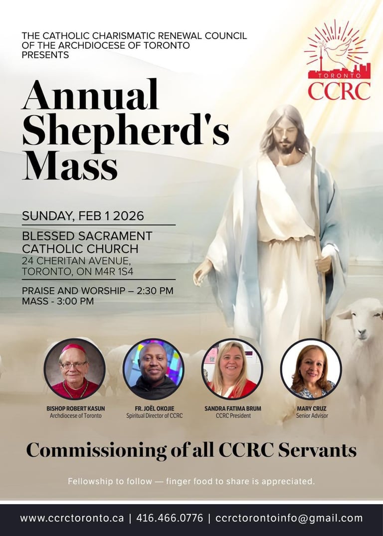The Catholic Charismatic Renewal Council (CCRC) is a vibrant ministry under the Archdiocese of Toronto, born from the fire of Pentecost and guided by the Holy Spirit. We are a family within the Catholic Church, united in our mission to form disciples of all nations.